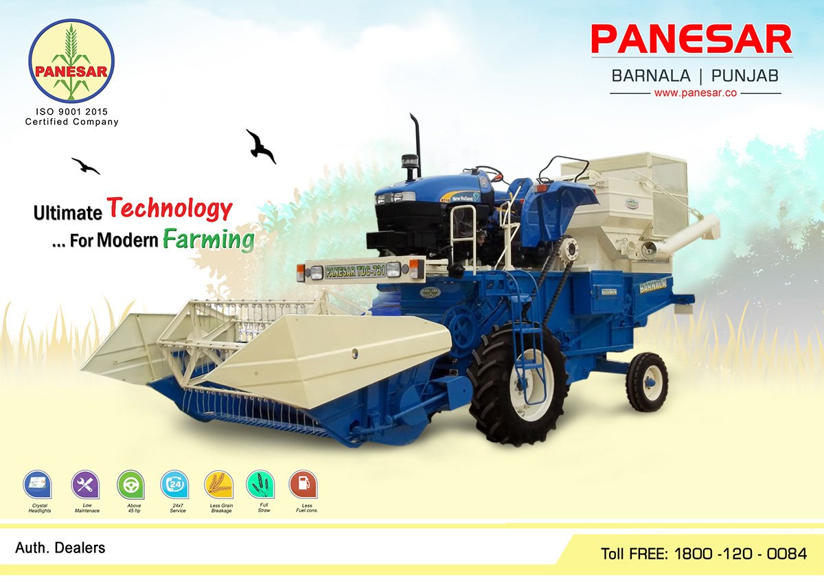 Panesar tc 731 combine harvester is containing ashok leyland powerful engine with power 76BHP at 2200 RPM. Panesar tc 731 has double drum threshing mechanism with threshing drum length is 585 mm, 1250mm and thresher drum speed is 750RPM, 800 RPM with upper sieve 495mm and lower sieve is 1397 mm.